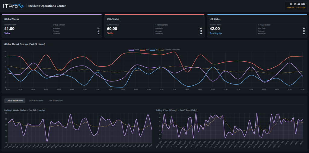 To help businesses stay ahead of the curve, IT Pro Expert has launched the public Cyber Incident Tracker, a live Network Operations Center (NOC) dashboard that monitors these exact panic metrics across the Global, US, and UK landscapes.