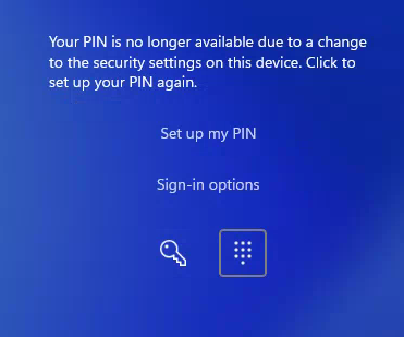 You may see “Your PIN is no longer available due to a change to the security settings on this device. Click to setup your PIN again.”
